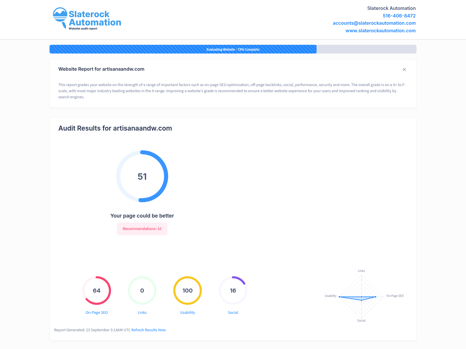 The audit of Artisana & W's website reveals a number of areas where enhancements could yield beneficial results. With an overall score of 51, the website is halfway to the score typically held by industry-leading sites. A definite strength lies in the site's usability which rates a perfect 100, indicating a user-friendly layout and navigation. However, the scope for improvement in performance, rated currently at 0, is enormous, suggesting that attention is needed in areas like site speed, mobile optimization, and server response time. On-page SEO displays a fair performance with a score of 64, but could benefit from more keyword optimization, meta-tag accuracy, and content marketing strategies. Noticeably lacking are off-page backlinks and a more pronounced social media presence, scoring 0 and 6 respectively. A more robust link-building strategy could yield better search engine ranking, while a stronger social media engagement could lead to better brand visibility and an increase in website traffic. These considered improvements, intelligently implemented, could greatly enhance visibility, user experience, and ultimately, lead flow to the website.