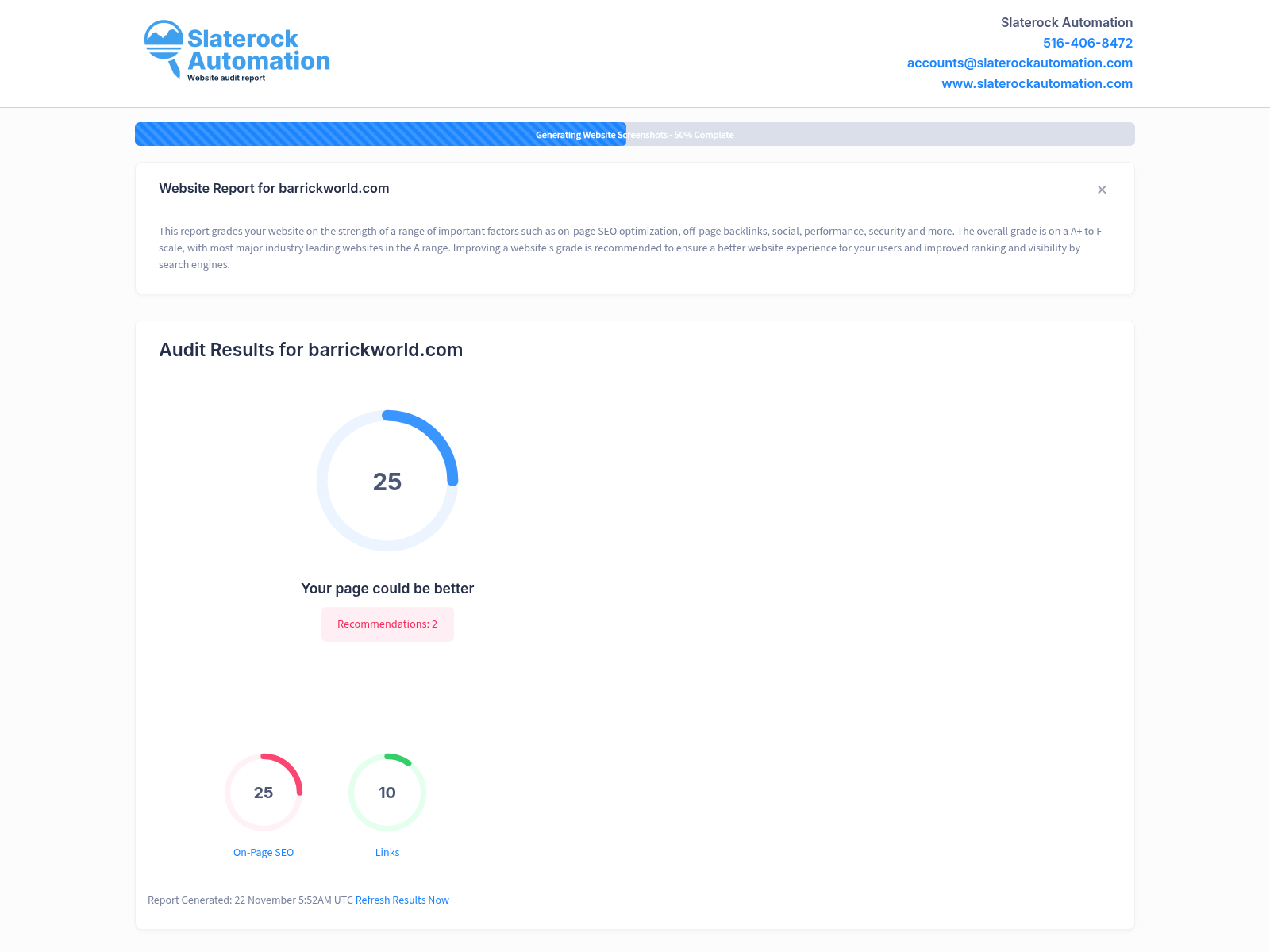 Barrickworld.com exhibits a few areas of strength as well as substantial opportunities for growth as depicted from its overall audit score of 25. Although your website has maintained a decent rating in on-page SEO activities, scoring 25 out of a possible 100, this is an area that would gain from continuous refinement to ensure your content, meta descriptors, and keywords are optimized, relevant, and beneficial to your visibility in search engines. However, your site's backlink score of 10 indicates a need for augmentation and diversifying of credible external and internal links. Your website's performance, usability, and social factors scored quite low, indicating an urgent need for immediate attention. If optimized properly, these elements could significantly better the user's experience, subsequently influencing your website's visibility and ranking in search results. In addition, integrating social media strategies would not only enhance online presence and brand visibility, but also improve site traffic and lead generation. Let's schedule a call to discuss potential strategies to leverage these opportunities for improvement.