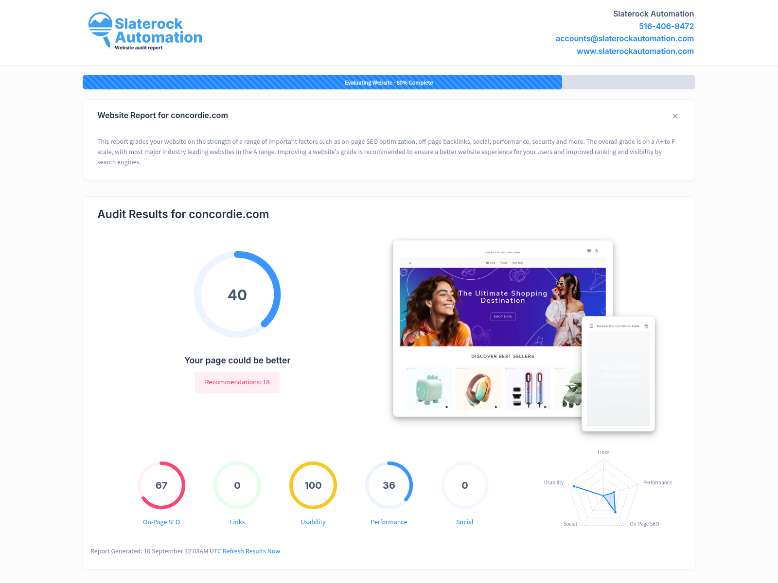 Analyzing Concordie.com, it becomes evident that the website has a few areas that need attention to enhance SEO performance. The overall score of your website is 40, falling significantly short of industry-leading websites which typically score 95+. Examining specific factors, the website's On-Page SEO leads with a fairly decent score of 67 suggesting room for improvement to reach the excellence level. However, the link building effort is non-existent with a score of zero and revisiting this aspect can dramatically increase your website's credibility and ranking. Usability of the website is commendable, with a perfect score of 100 - this reassures that visitors will have an optimal browsing experience. But to improve the overall score, the website's performance, which sits at 36, needs upgrading to ensure faster delivery of pages. A zero score in social suggests no social media presence; exploiting these platforms can significantly enhance your visibility and visitor engagement. To sum up, your website can benefit greatly from a streamlined strategy addressing these critical areas. We can help you enhance your website's performance with bespoke optimization strategies and specific, targeted improvements. Let's schedule a call to discuss in more details.