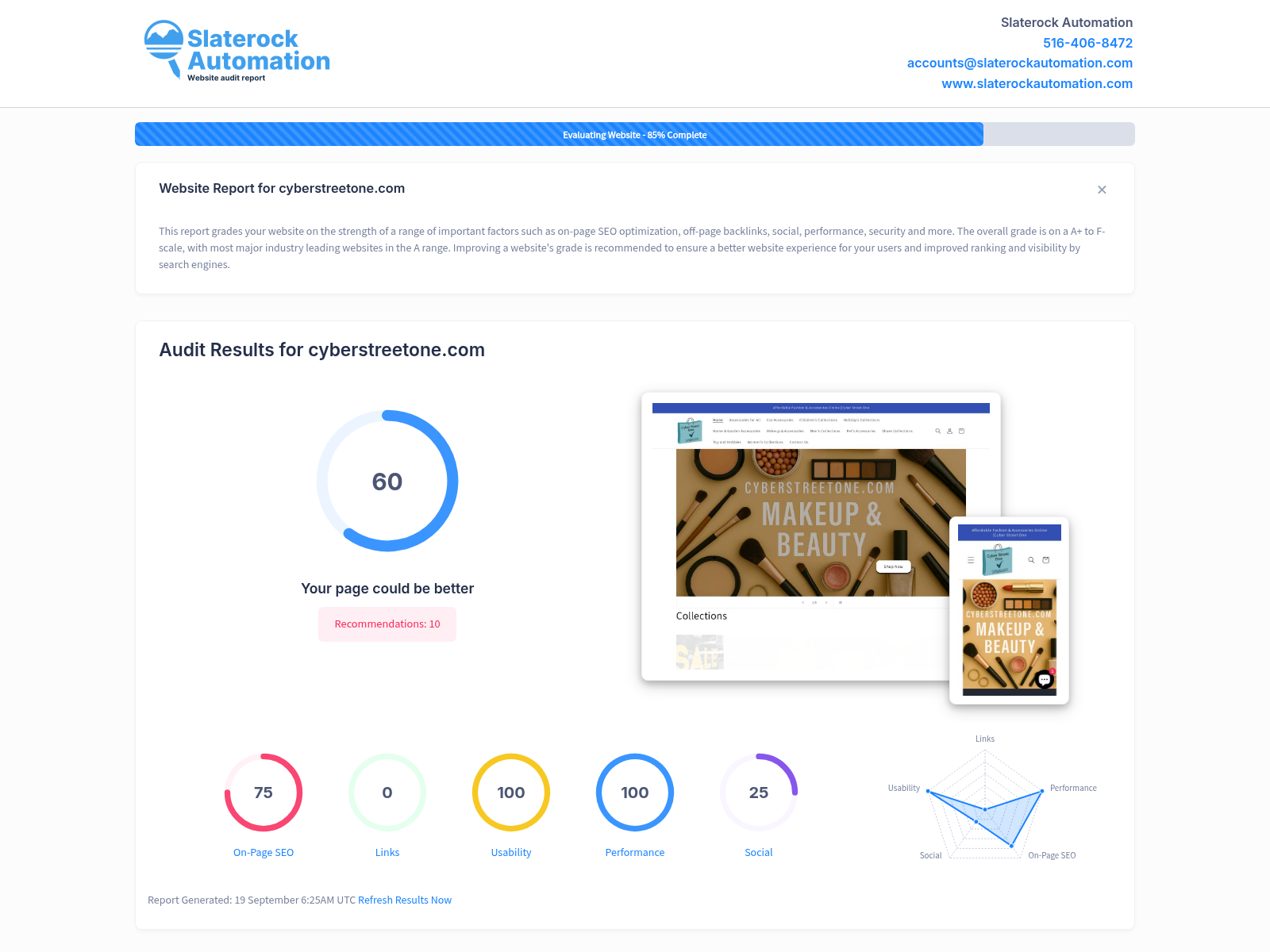 Having carried out an extensive audit on the cyberstreetone.com website, the overall score settled at 60, which indicates there's noticeable room for improvement, particularly in key areas. When it came to on-page SEO, the score was relatively strong at 75 although there's still an opportunity to refine certain aspects to drive a higher volume of organic search traffic. However, a critical aspect that requires immediate attention is the website's lack of back-links, currently scoring at 0. Developing a strategic link-building plan is highly recommended to promote site authority and boost search engine visibility. The website scored perfectly in the areas of useability and performance, indicating a flawless user experience and an efficient loading speed. However, the site's social score was quite low, resting at 25 which suggests there's a need to enhance the website's social media integration and drive forward more social media engagement with its user community. Maximizing these areas could significantly elevate rankings, increase traffic, and ultimately drive higher conversion rates.