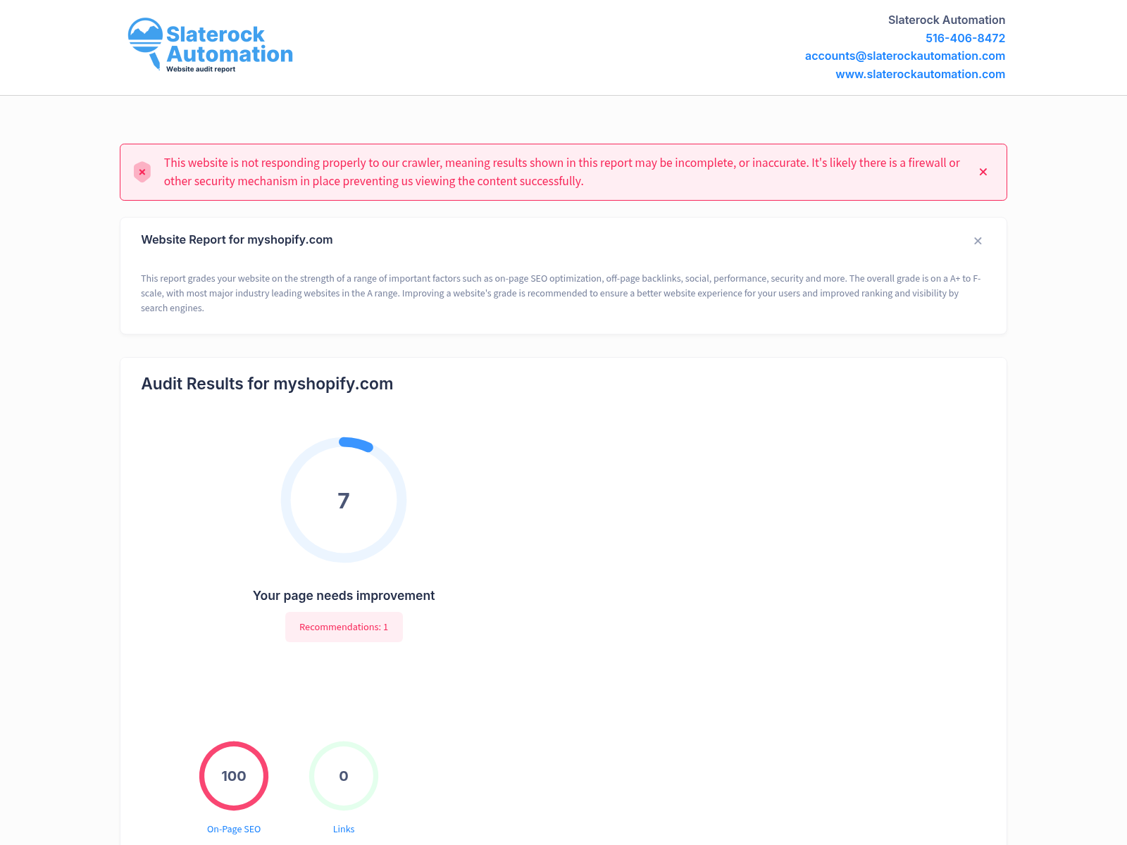 Myshopify.com's website audit reveals key areas for improvement that could significantly elevate its online performance. Despite excellent On-Page SEO with a perfect score of 100, clear deficiencies are evident in other vital components. The site currently scores 0 on links, usability, performance and social, culminating in an overall score of 7. This suggests a lack of functional inbound and outbound links, potential issues with the site's user interface, slow load times, and insufficient social media integration. Although these areas require significant attention, incrementally implementing solutions can lead to substantial improvements in both user experience and search engine visibility. Focusing on rectifying the website's performance through optimizing load times and enhancing the usability can significantly boost user engagement. Similarly, integrating quality backlinks and increasing social media engagement can help improve online visibility and website traffic. With a comprehensive remediation strategy, Myshopify.com can bolster its overall website performance.