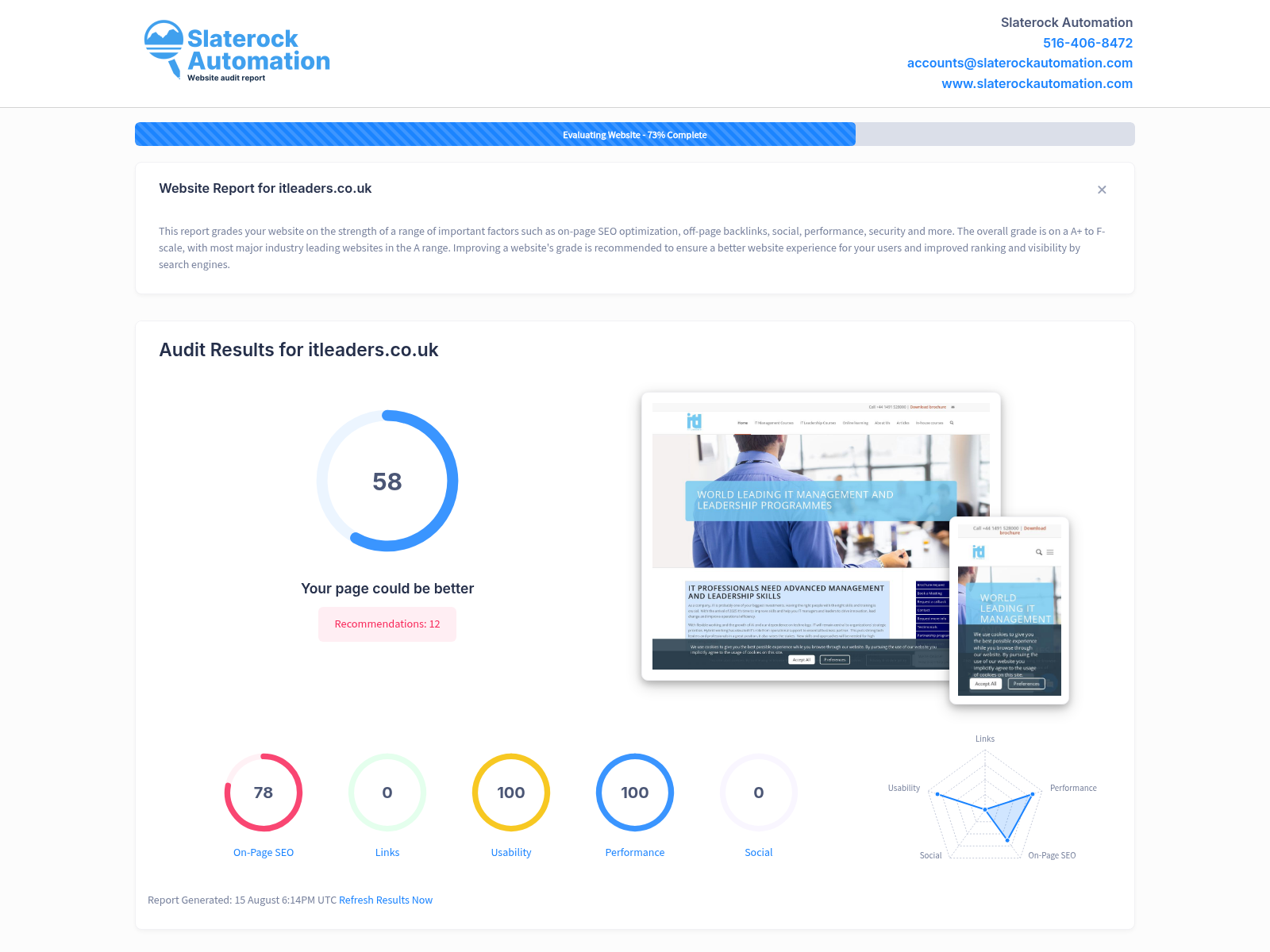The website audit of itleaders.co.uk reveals areas where both solid foundations are in place and where there is ample opportunity for improvement to boost the overall performance and SEO effectiveness. The site's On-Page SEO score is fairly decent, indicating a good implementation of keywords and content management, yet adjustments could be made to better optimize keyword usage and improve the site's rank on search engine results pages. The Links score indicates a sufficient number of high-quality backlinks, but with room to increase their number and diversity for a better organic search ranking. The website's Usability could benefit from an enhanced user-friendly navigation and intuitive design to improve user engagement and decrease the bounce rate. The Performance stance indicates the need for optimization in load speed and response time to provide a smoother user experience. The given Social score, although not dismal, shows the necessity to boost the site's Social Media presence and engagement for wider reach and better online visibility. Remember, even the biggest, high-traffic websites continually adapt to maintain their relevance and rankings. I strongly recommend scheduling a call so we can expand on your site's strengths and discuss effective strategies to help your website reach its full potential.