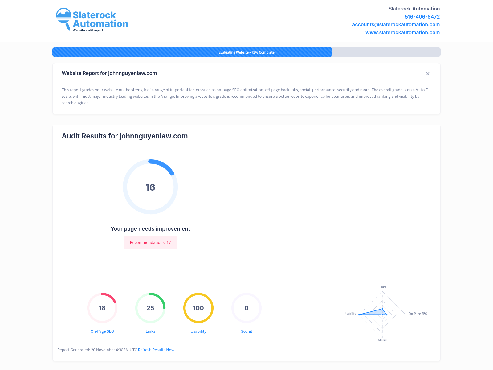 The website https://johnnguyenlaw.com displays mixed performances across different categories. With an overall score of 16, the site falls short of industry standards, which typically score in the 95+ range for optimal website experience. On a positive note, the website exhibits excellent usability, scoring a perfect 100, which suggests excellent user interface and navigation. However, there's significant room for improvement in categories such as performance and socials, both generating a score of 0. This indicates a need for better website speed, mobile optimization and social media presence. In terms of the site's SEO, it scores an 18 on On-Page SEO and 25 on links which indicates a need for comprehensive keyword planning, enhanced meta-descriptions, and increasing the number and quality of inbound and outbound links. To improve visibility, ranking, user experience, and ultimately conversion rates, it would be highly beneficial to consider an in-depth review of the SEO strategy and implementation.