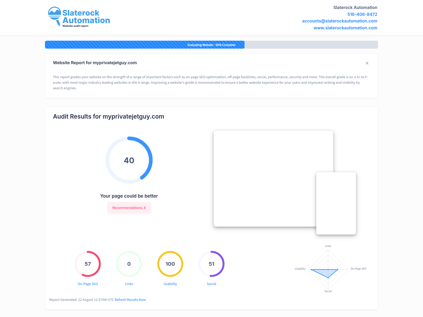 View the Website Audit Report for My Private Jet Guy located in Snohomish County, Washington.