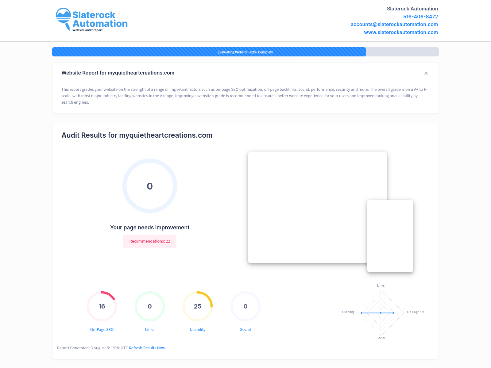 The audit for myquietheartcreations.com reveals several integral areas requiring improvement to boost the entire functionalities and overall score of the website. While the site's on-page SEO stands at 16, evidencing some implementation of keywords and content structure, there's still much room for enhancing the optimization process through activities including in-depth keyword research, metadata improvement, and optimizing images. The site also fares lowly in links, performance, and social aspects, all at 0, indicating the necessity for creating quality backlinks, improving performance in terms of loading speed and mobile responsiveness, and incorporating social media strategies. The usability score, with a moderate 25, indicates a need to enhance user experience, possibly with a more intuitive design and easy navigation. By rectifying these elements, we can boost the visibility and search engine ranking of your website, drawing in increased traffic and leads. Let's catch up on a call and discuss the comprehensive strategy to improve your website.