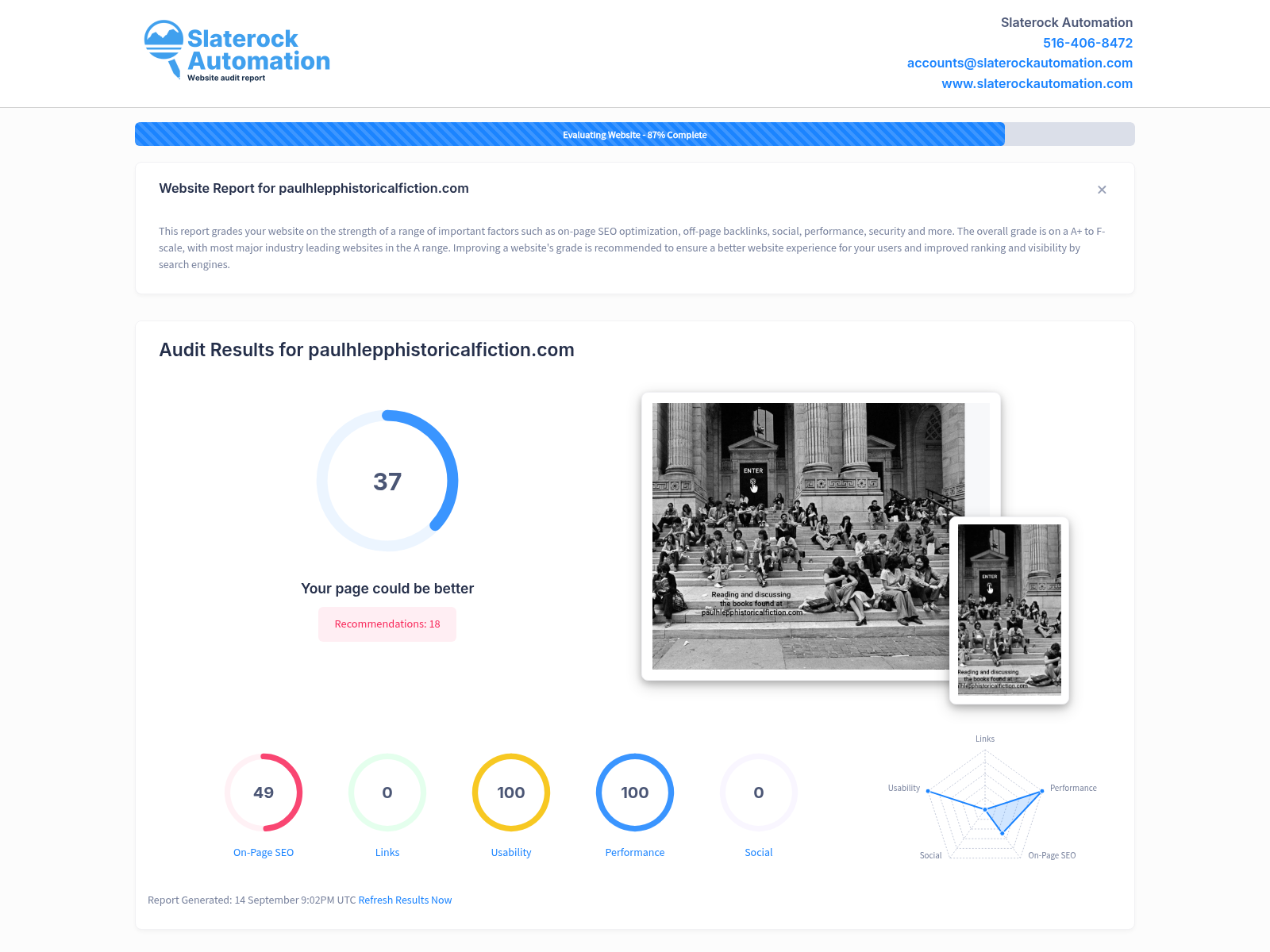 The website PaulHLeppHistoricalFiction.com has shown a solid framework in terms of useability and performance, reflecting an intuitive layout and rapid page loading times, which contributed to a perfect score of 100 in both categories. However, there are key areas where the website could benefit from strategic enhancement. A primary concern is the absence of off-page backlinks (Links = 0) and social integration (Social = 0), both of which are crucial not only for exposure but for improving site visibility and search engine ranking. The On-Page SEO score is somewhat close to average at 49, indicating that while foundational elements may be in place, there's potential for considerable improvement by adding high-quality, properly-formatted content and well-researched keywords. Despite an overall score of 37, it's important to note that with dedicated attention to these areas, the website has a high potential to elevate its industry standing, attract higher traffic, and increase lead generation. Enhancing these areas would undoubtedly pave the way for a better website experience for users and foster improved visibility by search engines. We look forward to discussing how we can assist in elevating the website to its utmost potential.