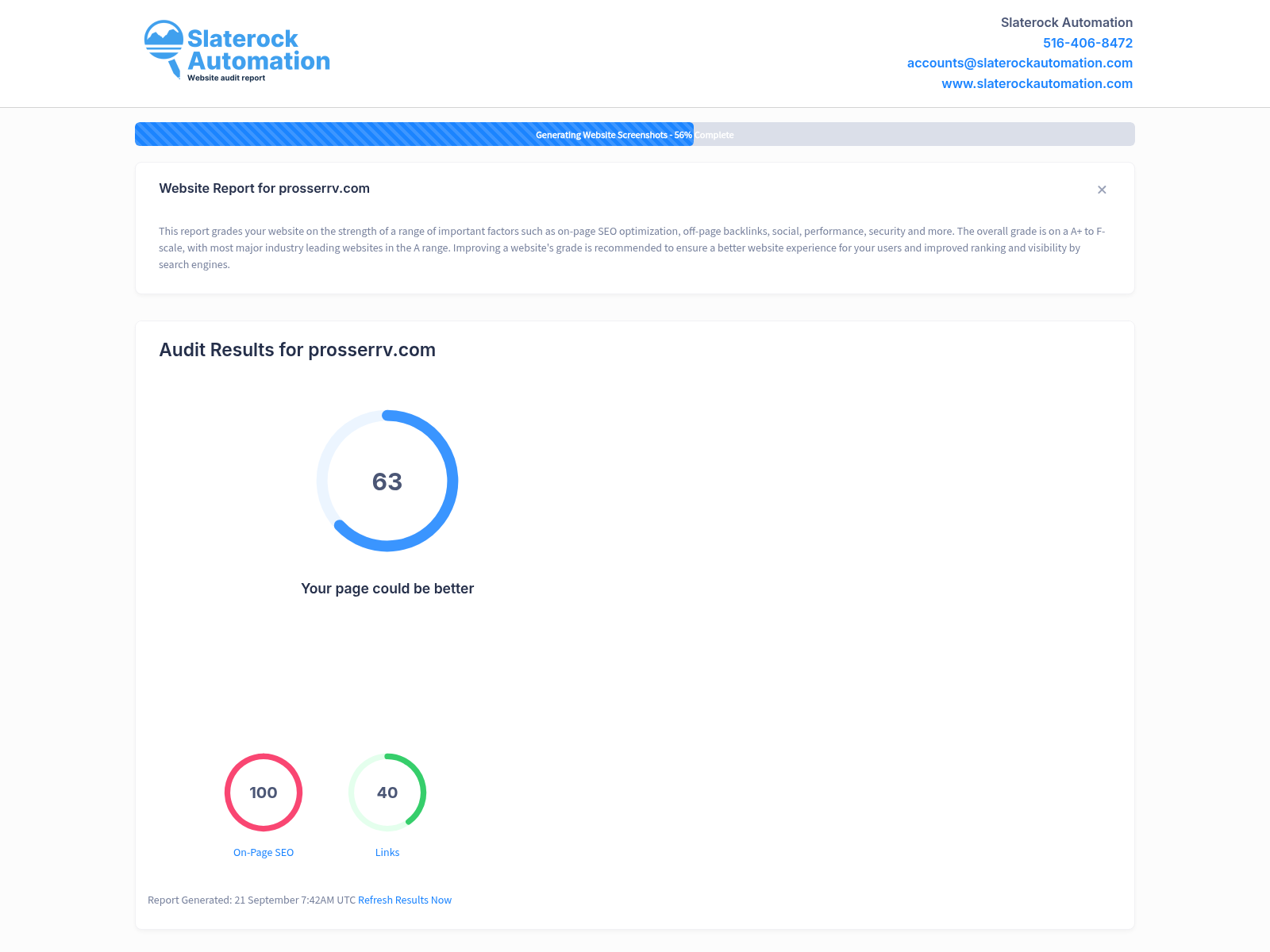 ProsserRV.com currently has an overall website audit score of 63, indicative of some solid functionality but also areas requiring significant attention to fully optimize its digital presence. On a very promising note, the website scores a perfect 100 on On-Page SEO, suggesting successful optimization of content which promotes visibility. However, the scores for Links, namely off-page backlinks, is quite low at 40, suggesting a need for a more strategic approach to link-building to improve site authority. More pressing is the score of 0 for Usability, Performance, and Social metrics. Enhancements in website load time, mobile compatibility, user friendliness and integration of social media could significantly boost overall user experience and site ranking. By investing in these areas, ProsserRV.com could greatly enhance its online visibility and the site's ability to generate increased traffic and lead flow.