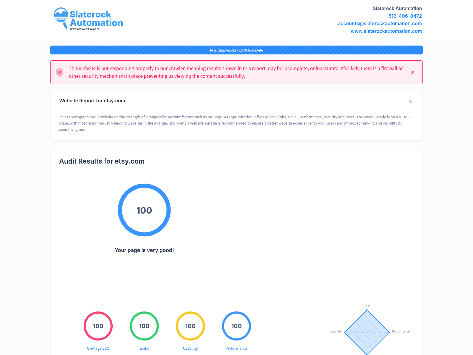 Etsy.com achieves an impressive score in our overall website audit, with full marks in crucial areas such as on-page SEO, linking strategy, website usability, and performance. These formidable results indicate a robust optimization of the website's framework, a strong backlink profile, a user-friendly interface, and efficient site speed, all of which contribute to a top score of 100 overall. This performance is in line with the most successful industry-leading websites typically scoring above 95. However, the analysis shows a significant lack of engagement in the social aspect with a score of 0. Despite their fantastic achievement in other areas, this suggests a missed opportunity for Etsy to further increase its site visibility and user interaction through popular social media platforms. This enhancement can notably lead to improved visitor conversion rates, expand brand awareness, and foster a stronger rapport with users. It would be beneficial for Etsy to integrate social media strategies into its overall SEO plan to fully maximize its online presence and leverage all possible avenues of customer interaction.