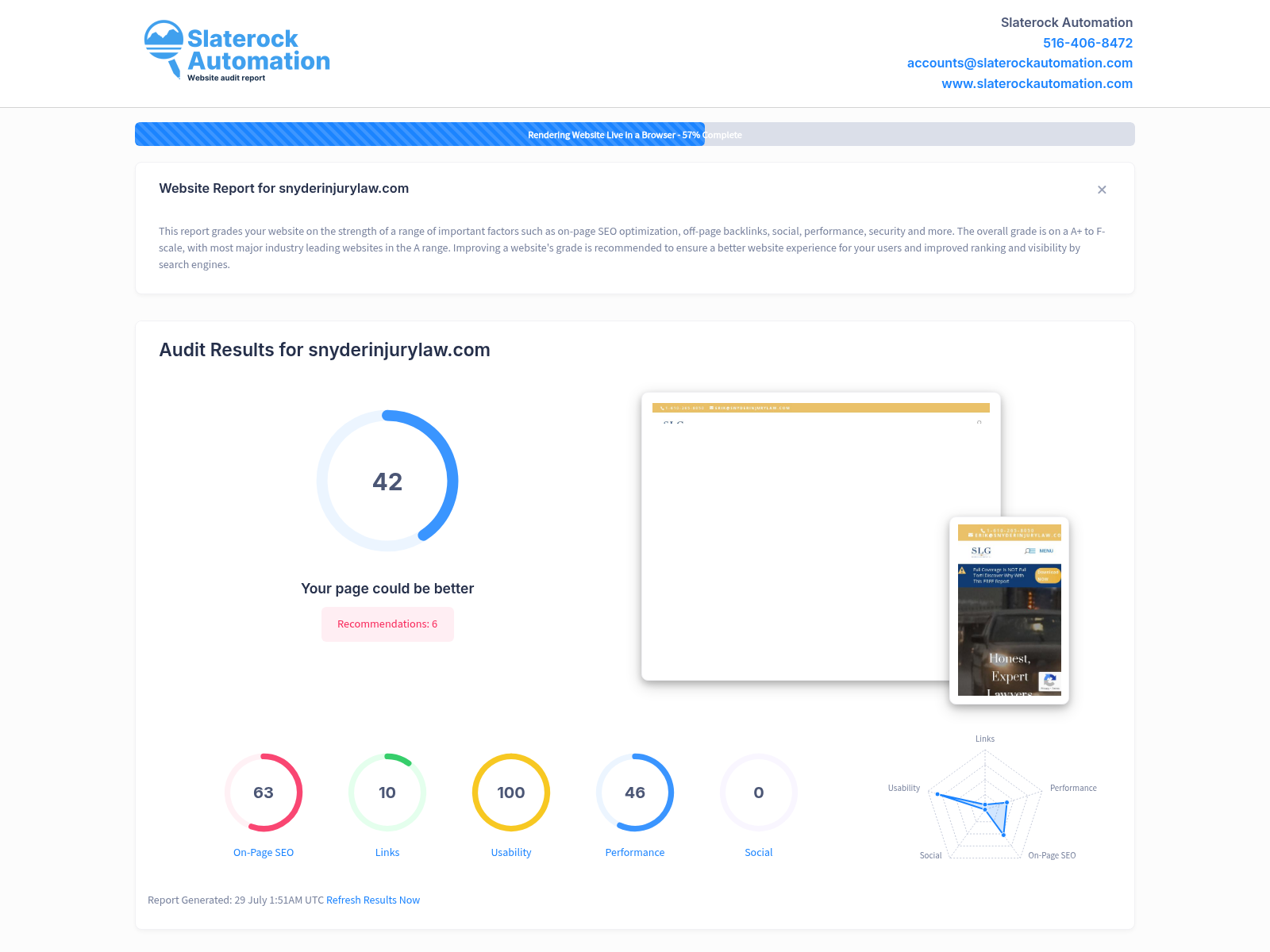 The website SnyderInjuryLaw.com currently has an overall score of 42 out of 100. With its stellar usability score, users find it easy to navigate which demonstrates commendable design and layout. However, its performance is significantly low at 6, indicating that the site speed and load time could be improved for a better user experience and SEO ranking. The on-page SEO, evaluating the optimized content and HTML source code, is at a satisfactory 63. However, there is a notable deficiency in the links score (at 10), signaling that a serious audit and restructuring of the website's backlinks could raise this score and increase its search engine visibility. Moreover, the website registers no activity in terms of social media engagement (scored at 0), which can significantly boost visibility and organic search rankings if improved. Advancing these areas would further augment the website's credibility, increase its online visibility and enhance overall user experience. With professional assistance, we are confident these improvements can lead to an increase in traffic and ultimately, business growth.