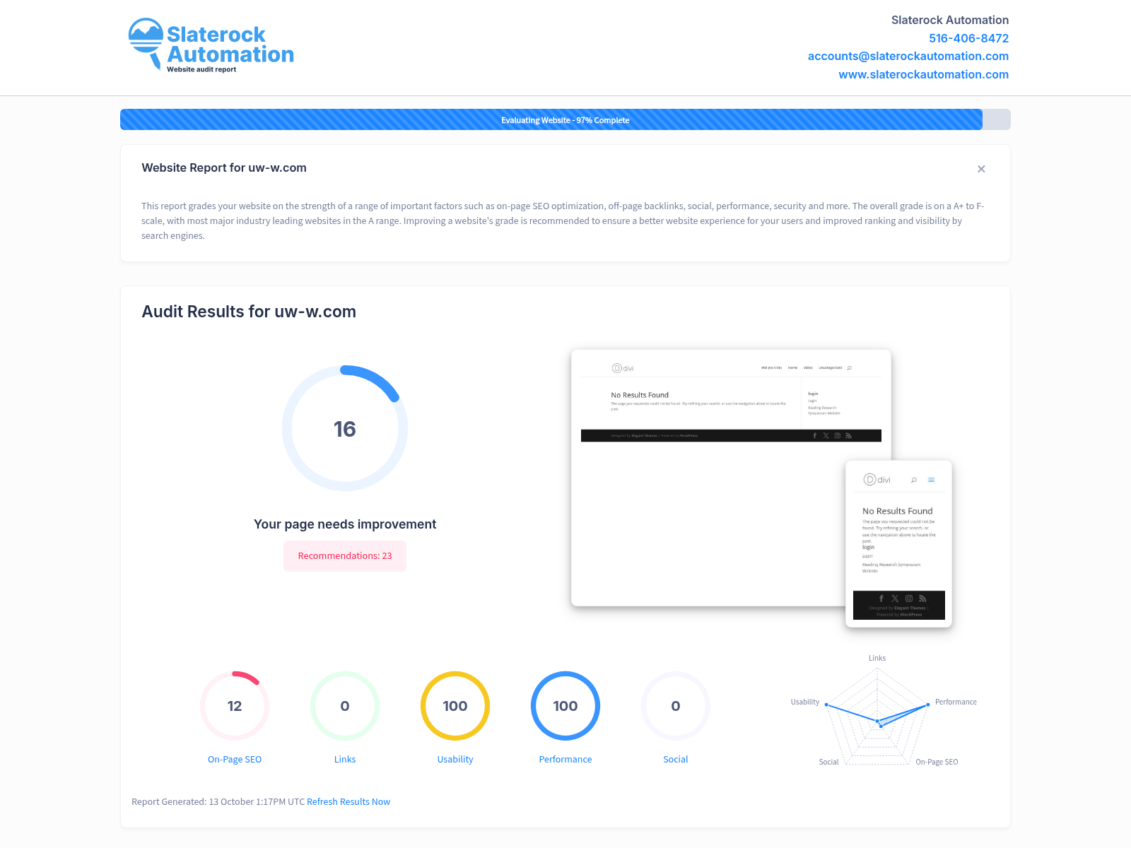 Our comprehensive audit of uw-w.com revealed distinct areas for possibly beneficial developments. Garnering an overall score of 16, uw-w.com demonstrates commendable results in useability and performance, both maxing out at 100 which is remarkable, indicative of seamless user interaction, swift page loads and overall operational efficiency. However, considerable growth opportunities lie in other important sectors vital for improving your site's visibility. The site's On-Page SEO score of 12 suggests the need for further optimization, such as refining meta-descriptions, title tags, or possibly content modifications, to enhance organic visibility. The absence of incoming links as indicated by a score of 0 means a potential need to implement a robust link-building strategy for improved domain authority. Similarly, the site's non-existent grade in the social sector stresses the need for exploring social marketing to engage a broader audience. Each of these adjustments can progressively elevate your site's score closer to the 95+ range typical of industry-leading websites, undoubtedly boosting user experience, search engine rankings, and overall visibility.