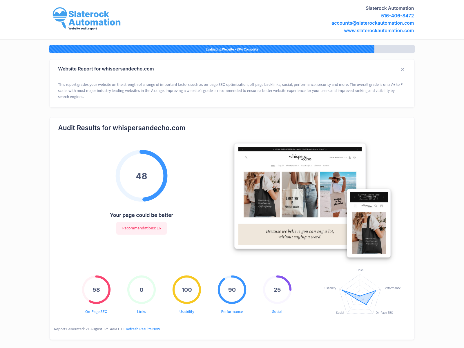 The Whispers and Echo website has a commendable user-friendly design, achieving a perfect usability score of 100 and an impressive performance score of 90. However, there are still areas where considerable improvements can be made as presented by the overall audit score of 48. One such significant area of development lies within backlinks, currently scoring 0. Backlinks are crucial for enhancing your site's SEO as Google views them as votes of confidence, enhancing your website's trustworthiness. Furthermore, social engagement represented by the social score of 25, can be escalated. The present social media integration is minimal, so creating a more dynamic online presence can help widen your audience and increase user engagement. The on-page SEO score is at 58, indicating room for improvements in optimization methods, which can include keyword integration, meta descriptions, and relevant content updates. By focusing on these areas, you can significantly drive more organic traffic, create lead flow, and increase overall website visibility on search engines.