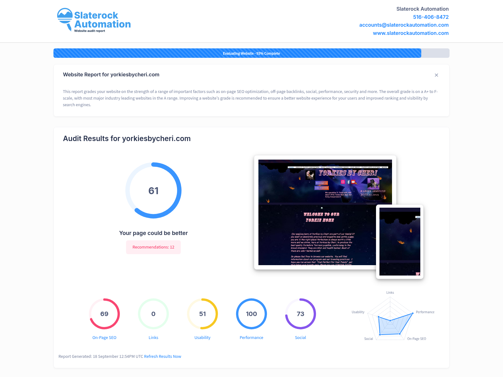 Yorkies by Cheri's website (https://yorkiesbycheri.com) demonstrates a reasonable degree of optimisation with an overall score of 61 out of 100. While the site's performance is stellar at 100, indicating swift load times and efficient coding, it falls slightly short in terms of on-page SEO and social media engagement, scoring 69 and 73 respectively. This suggests that while the content is somewhat optimized for search engines, there is potential for further SEO refinement and social media strategy to expand reach and visibility. Surprisingly, the website falls short in backlinks scoring at zero, suggesting a lack of external sites linking back to it. This factor is critical for improving search engine ranking and should be addressed urgently. The site's usability score stands at 51, perhaps indicating a need for a site redesign or architecture to ensure an enhanced user experience and accessibility. With a solid performance base in place, with focused efforts on creating much-needed backlinks, applying additional on-page SEO methods, escalating social media efforts, and improving site usability could considerably boost the website's overall effectiveness, potentially leading to increased traffic and conversions.